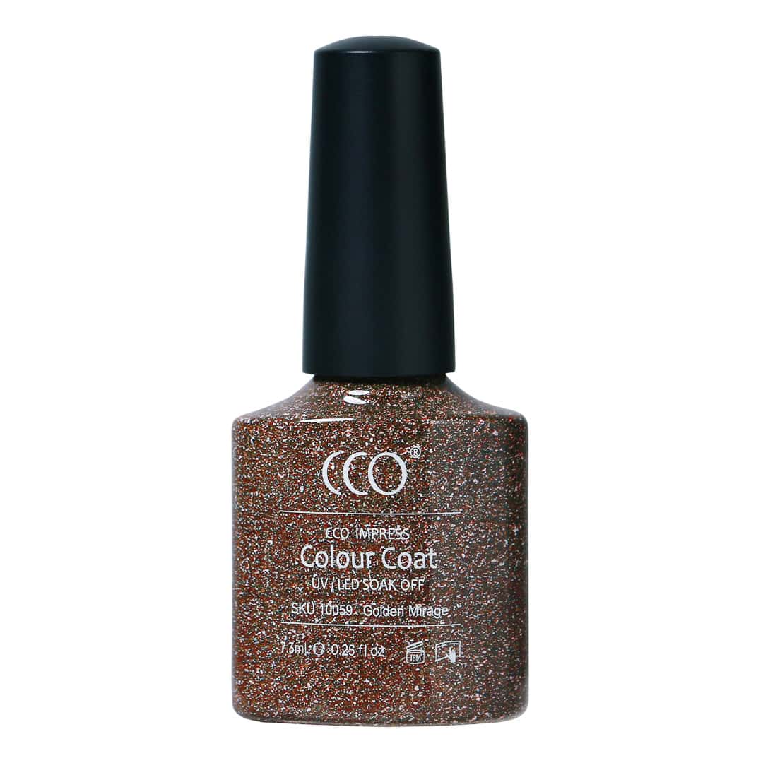 Golden Mirage is een sprankelende platinumkleurige gellak, doordrenkt met warm bronskleurig pigment voor een luxe, zonovergoten uitstraling. Deze dekkende tint vangt het licht prachtig en combineert moeiteloos met nude- en bruintinten, waardoor hij perfect is voor een stijlvolle, natuurlijke look met een glinsterende twist.