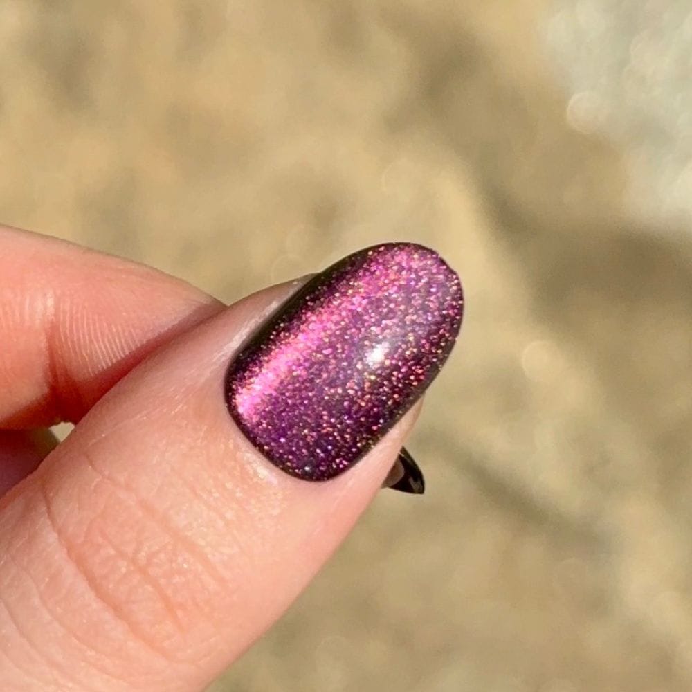 Epic Festival is een kameleon cat’s eye met diepe tinten aubergine, mosgroen en lichtbruin. Deze kleur heeft een warme, vintage uitstraling en voelt stijlvol en volwassen aan zonder zwaar te worden.
